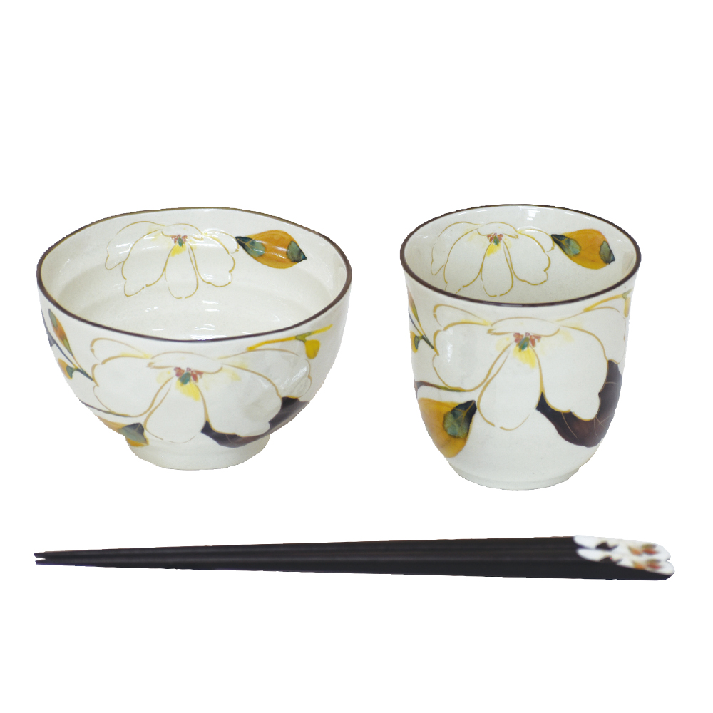 • 花かいろう飯碗湯呑 木蓮(天宝箸付)